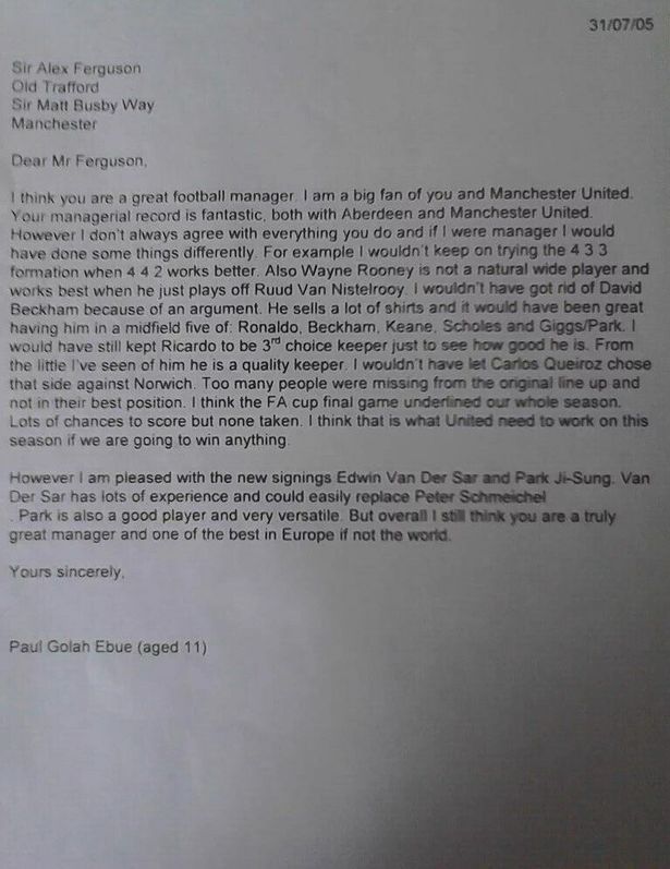 11歳のポール・ゴラー・エブエ君が2005年にファーガソンに宛てて書いた手紙である。そこには、ファーガソン監督は素晴らしい監督だと認めつつも、自分なら違った選択をとると書いてあった。