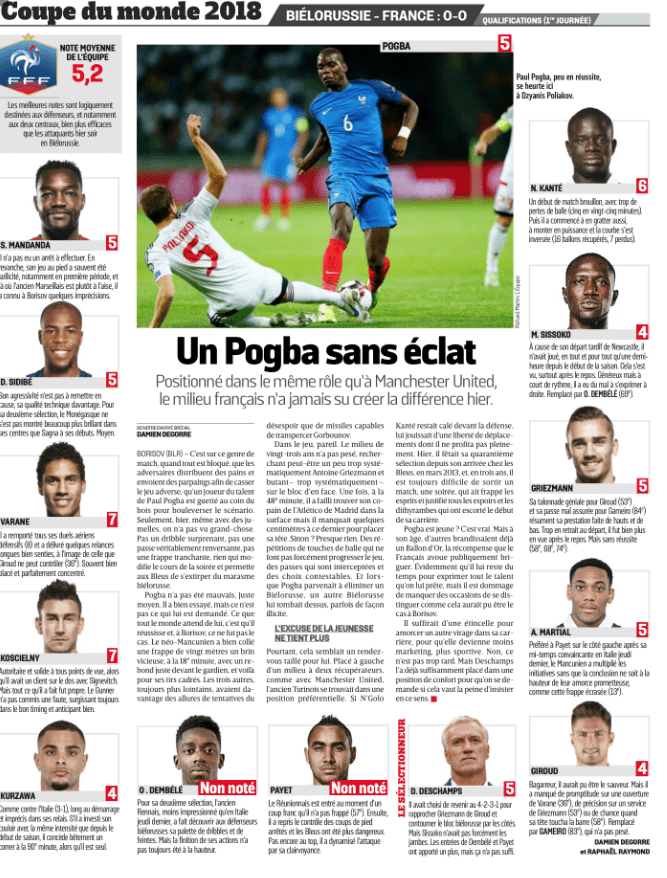率直に言ってフランスのメディアは自国代表のパフォーマンスに納得せず、L’Equipe紙では何人かの選手にとりわけ低い評価を下した。
